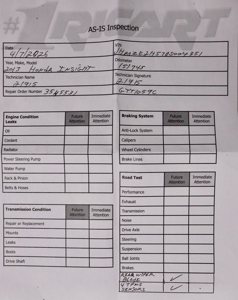 Efficient, practical, and designed for everyday driving, this 2013 Honda Insight LX delivers a reliable hybrid experience with impressive fuel economy and compact versatility. Powered by a 1.3L i-VTEC 4-cylinder engine paired with an electric motor and continuously variable transmission, it produces a combined 98 horsepower while achieving around 41 MPG combined for excellent efficiency. Inside, the cabin features comfortable fabric seating, a user-friendly layout, and a 160-watt AM/FM/CD audio system with four speakers for everyday convenience. Finished in Taffeta White with a Black interior, this Insight LX offers dependable performance and smart efficiency in a compact hatchback design. Available now at Ricart Automotive Used Car Factory.
