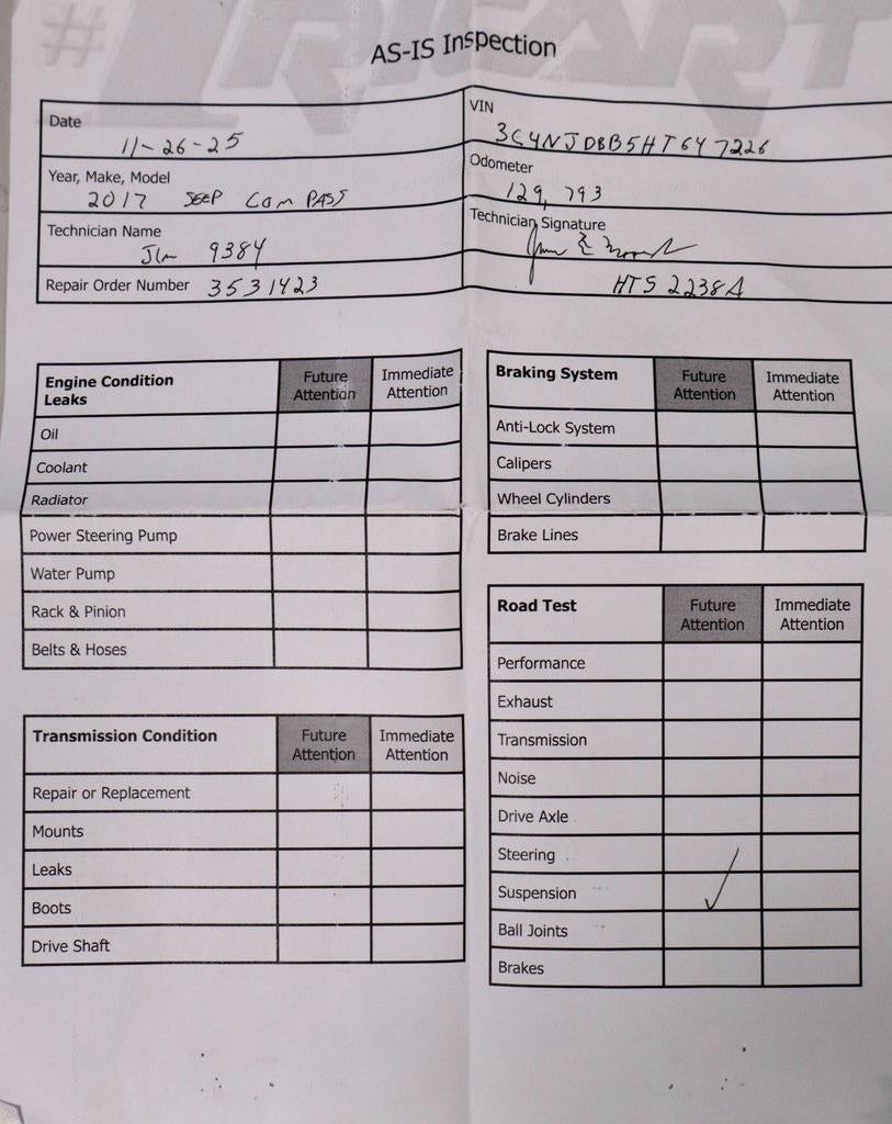 This 2017 Jeep Compass Latitude 4x4 delivers compact SUV versatility with confident four-wheel-drive capability and everyday practicality. Powered by a 2.4L I-4 MultiAir engine paired with an automatic transmission, it offers smooth, composed performance for daily driving and changing road conditions. The interior provides a comfortable, driver-focused cabin enhanced by the Customer Preferred Package 21J and Cold Weather Group, adding convenience and seasonal comfort, while 17-inch silver-painted aluminum wheels complete the look. Built with Jeep capability in mind, this Compass Latitude is available now at #1 Ricart Express Newark!