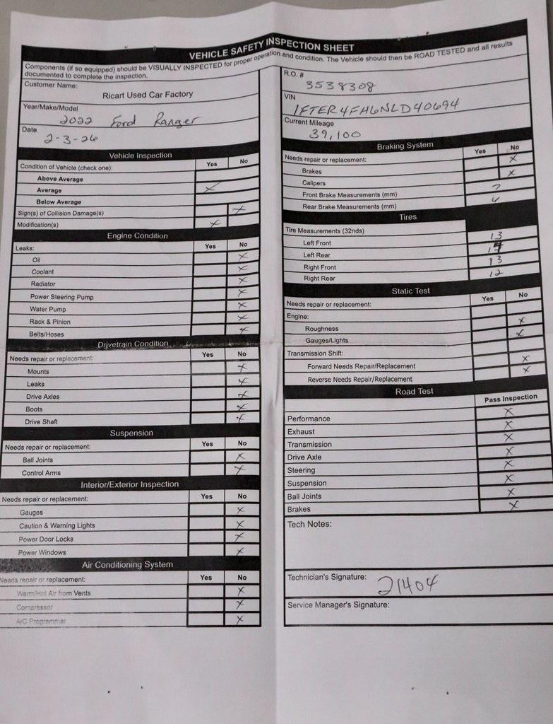 This Ford Ranger XLT stands out immediately thanks to the Roush Appearance Package, transforming it into a bold, performance-inspired truck with unmistakable street and off-road presence. The Roush upgrades lead the experience, highlighted by a custom Roush grille with dual LED light bars, Magnetic Gray fender flares with integrated lighting and heat extractors, 18-inch satin black Roush wheels wrapped in 32-inch General Tire Grabber A/TX tires, and distinctive Roush graphics, red tow hooks, and serialized badging. Performance is elevated further through a Roush/Fox 2.0 suspension system and Roush cat-back exhaust, delivering enhanced handling and an aggressive exhaust note to match its looks. Inside, the cabin is upgraded with premium quilted leather seating, embroidered headrests, Roush-branded trim, and serialized interior badging, blending exclusivity with everyday drivability—Available now at Ricart Automotive Used Car Factory.